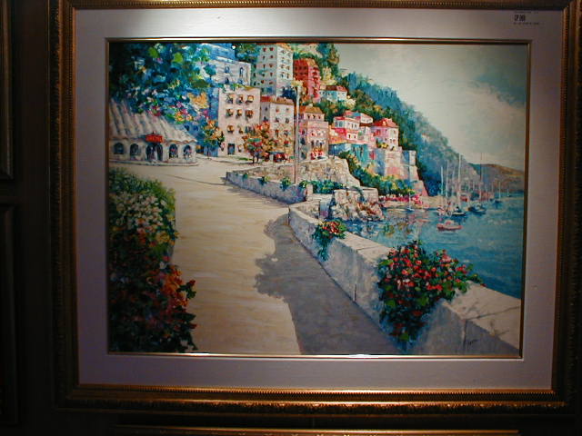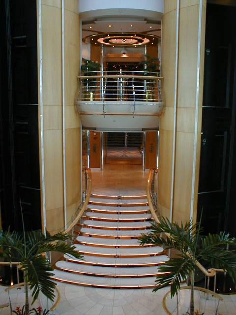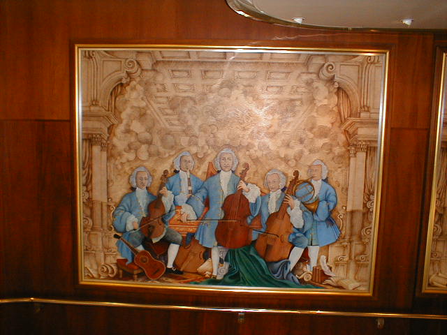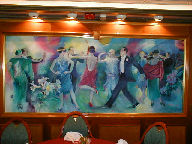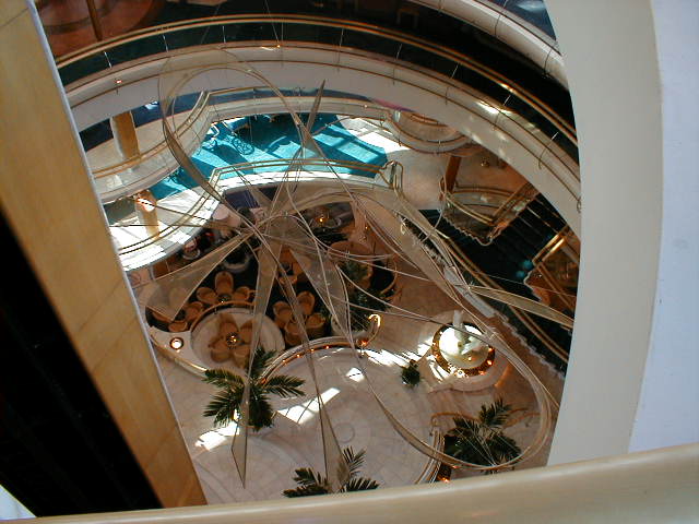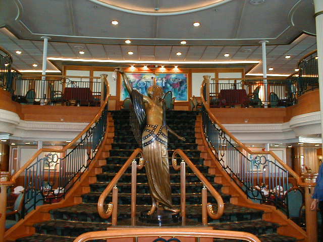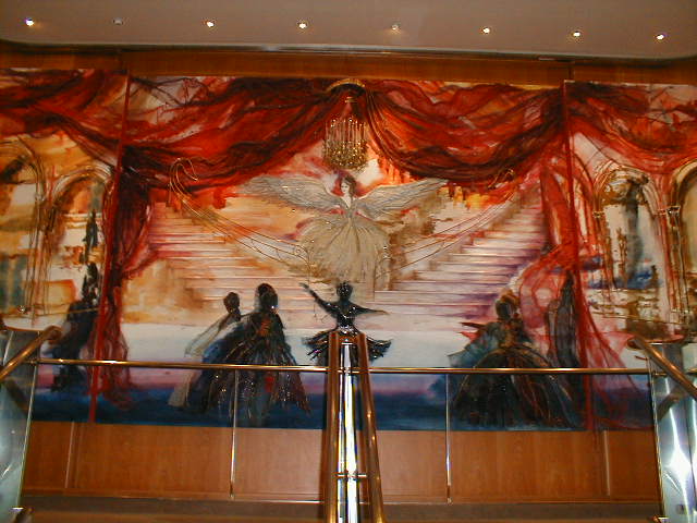 Sailing on the Grandeur of the Seas is like living in an art gallery for a week. I've sailed on beautifully appointed ships before, but the Grandeur had more art and better art than any other ship I've ever seen. There was an enormous variety of styles and media, large, breathtaking paintings, impressive sculptures, modest little multimedia works along the halls, and a tastefully spectacular interior which, even over the course of the entire week, I never was able to take for granted. The entry foyer, called the "Centrum," rises seven decks right up through the middle of the ship with two grandly contemporary stairways and two glass elevators which seem to soar up and up forever. There was enough polished marble under foot and everywhere else, you wonder how the ship floats. Polished brass and glass, rich woods and soft carpet compete - but lose - to the art in every public area of the ship. The variety of styles in both the painting and sculpture was broader than on most ships. Usually, shipboard art bends heavily toward the abstract. There was some of that, but also an impressive amount of representational work in perhaps a dozen different styles and always of gallery, if not museum, quality. I saw only one piece of art on the entire ship which I felt was out of place in such a setting (a huge, hanging, dusty, Wright brothers reject hovering over the Centrum). On the other hand, I'll never forget the slightly larger than life bronze sculpture of a turn-of-the-20th-century teenaged boy, dressed in knickers, bow tie, jacket, and cabby cap, map in hand, gazing upward in eye-popping, jaw-dropping awe. For me, he symbolized the whole week.