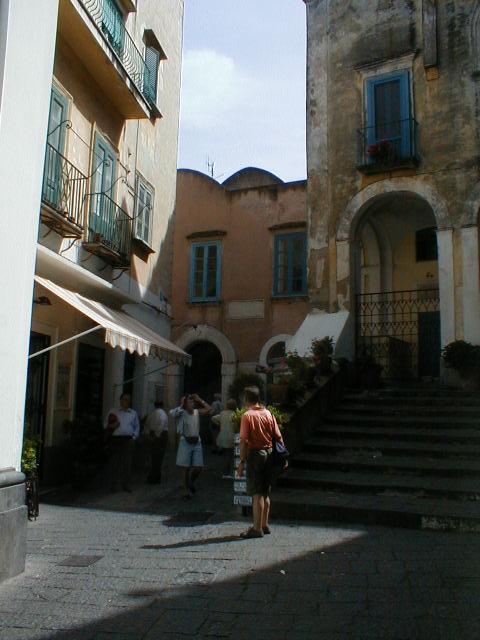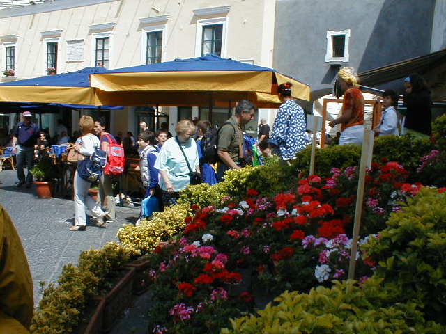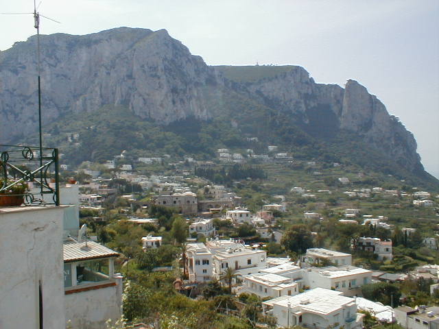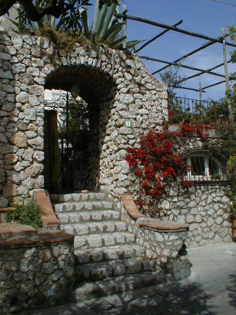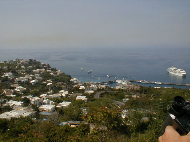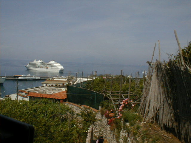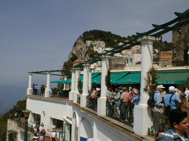 The island of Capri is shaped like a misshapen figure eight, with one high peak and one lower peak joined by a "high valley" between them. To get up to the tiny town square located in this "valley" from the port below, you take a steeply inclined railway the Italians call a "Funiculare." One might characterize it as an enclosed escalator with seats. The good news is it doesn't take cars. The bad news is, I was on my feet for three solid hours. Worse than that, I was lost most of that time. The good news is, Capri is a lovely little town to get lost in. I found that even the back streets and back gates of many of the small, but expensive "villas" which cling to the island's gentle slopes are really quite attractive. The cats and dogs and other natives are friendly, and the views are breathtaking. Groceries are delivered by golf cart. The ice cream is sinfully delicious. Salt and Pepper shaker sets cost $14. The artwork for sale in chic little galleries and spotlessly clean hotels is shamefully overpriced, and one corner of a huge commercial building juts right up to the front steps of the town's hundred-year-old church, leaving one to wonder which was there first. It's a nice place to live but I wouldn't want to visit there again.