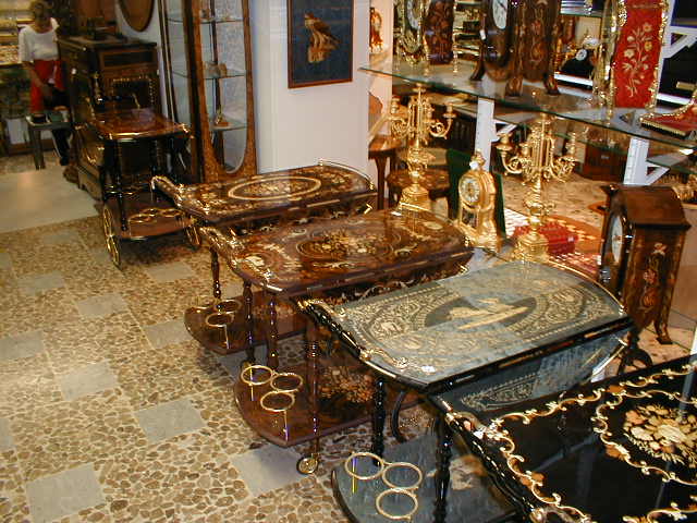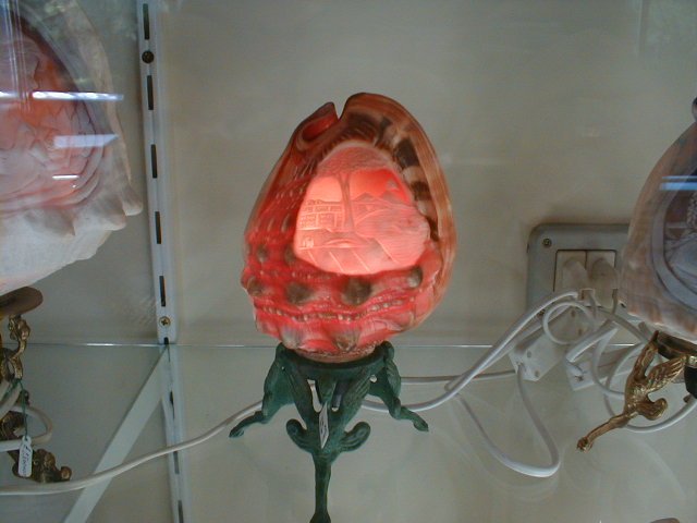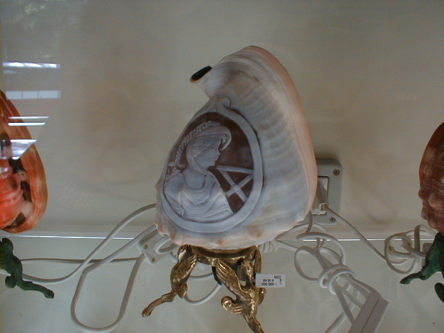 The highway leads past a small "factory" (actually more showroom than factory). For once the parking lot is adequate, if not spacious. Inside is housed a national treasure. With the discovery of the ruins of Pompeii in the eighteenth century, came the rediscovery of an old, all-but-forgotten art form. Preserved among the city's ruins were exquisitely carved sea shells worn as jewelry. Conque, and many other larger sea shells are naturally layered in various colors. The ancient Pompeiians had learned to carve images in the outer layers, usually lighter in color, to create faces and figures, backed by darker, yet highly translucent layers of shell. These they framed in gold and hung around the necks of the fairer sex. Often, they were all the personal belongings that survived the devastation caused by Mount Vesuvius on August 24, 79 AD. Today, the cameo industry flourishes in the shadow of the now peaceful mountain which preserved it. A tiny, 3/8-inch, cameo locket mounted in silver with chain, which I bought for my wife, was $70.