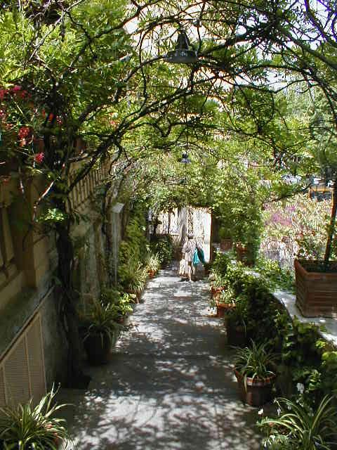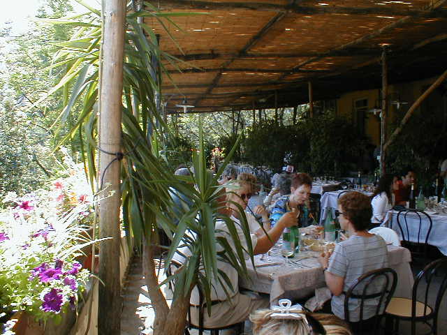 Further south, around the huge Bay of Naples, moving ever closer to the toe of the Italian boot, the feeling is that of a scaled down French Riviera. The cliffs are not so high, but every bit as difficult to impose roads upon and every bit as breathtaking. Here, the city of Sorrento has grown too big for its real estate. The landscape is too beautiful for its own good. Strangely, every so often, very deep geologic "gashes" appear unexpectedly within the city. Most are filled with vegetation, a few have streets ascending their vertical sides. All are most peculiar. It was in Sorrento we ate at a picturesque terrace restaurant bordering one of these deep ravines, right in the middle of the busy downtown area. Italy is famous for its two-hour lunches followed by three-hour naps. I like that about Italians. Much as I might have liked to, we didn't nap after lunch, we shopped. Then we caught the hydrofoil (in name only) from the sun swept city docks to the enchanting island of Capri just three miles off shore.